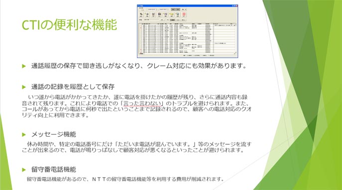 CTIとは、電話やFAXをコンピュータシステムの一部として統合することです。