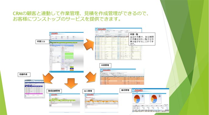 CRMの顧客と連動して作業管理、見積を作成管理ができるので、お客様にワンストップのサービスを提供できます。
