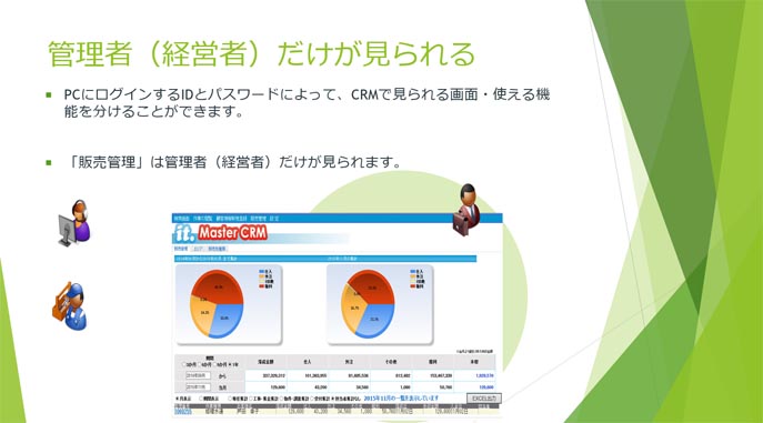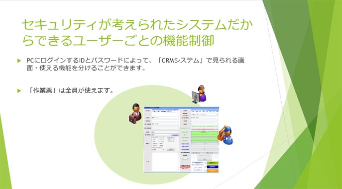 PCにログインするIDとパスワードによって、CRMで見られる画面・使える機能を分けることができます。